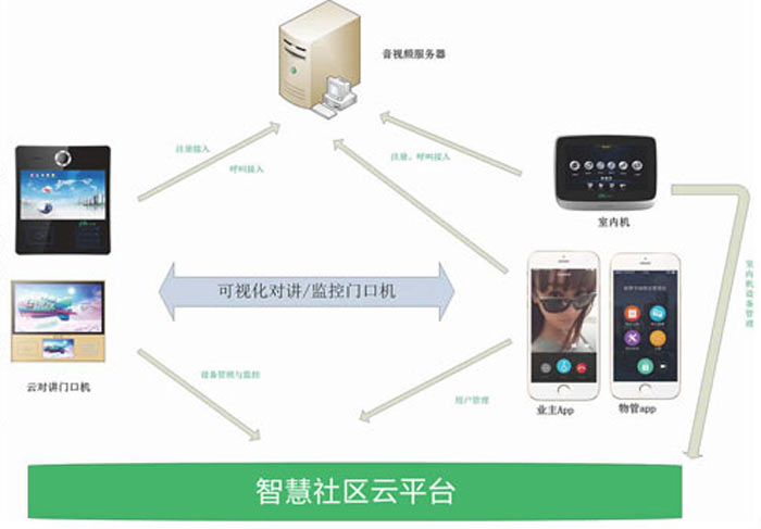 采用“云對(duì)講門口機(jī)+云平臺(tái)+音視頻平臺(tái)+室內(nèi)機(jī)+業(yè)主app+物管app”的系統(tǒng)架構(gòu)