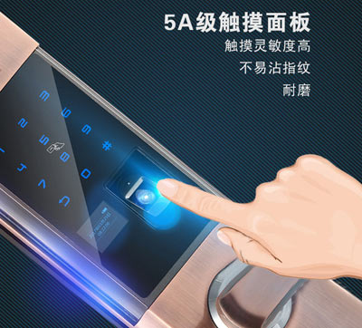 AJL-6601指紋鎖采用加厚鋅合金外殼,更安全、更耐用;5A級觸摸面板靈敏度高,不易沾指紋耐磨。