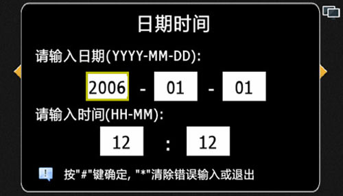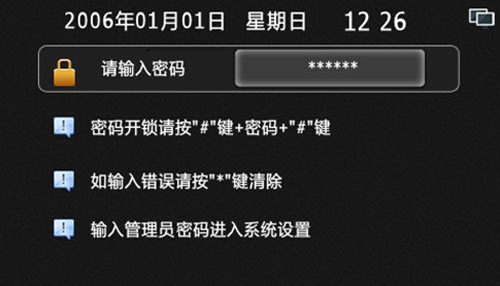 1) 設置機器的時間和日期,如果設置時間不合理,則會提示設置失敗。設備開機或運行時會自動同步物業中心軟件的時間。格式為安居樂X-XX-XX XX:XX,例如2006-1-1 12:00,“*”鍵可清除錯誤輸入,“#”確定保存并退出,設置界面如圖4.10.1: