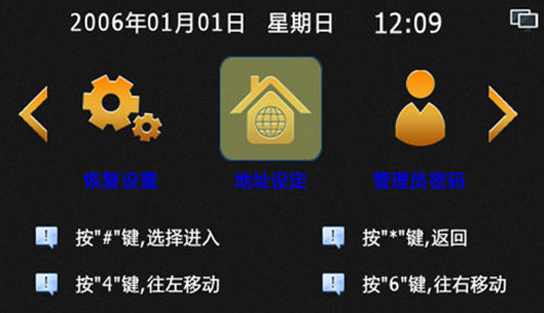 1) 進入系統設置:主界面輸入“#”+6位管理員密碼+“#”(出廠默認管理員密碼為666666),進入系統設置界面,“*”鍵退出或清楚錯誤輸入功能,“#”鍵為確定功能,“4”和“6”左右移動選擇,進入時默認為地址設定,如圖4.1.1: