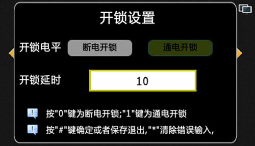 1) 設置電控鎖的開鎖方式以及開鎖延時,默認為通電開鎖,延時為10秒,。按“0”選擇斷電開鎖,按“1”選擇通電開鎖,按“#”進入開鎖延時選項,輸入延時后按“#”鍵保存(延時范圍為1-150秒),按“*”鍵可清除錯誤輸入或退出開鎖設置界面,如圖4.7.1: