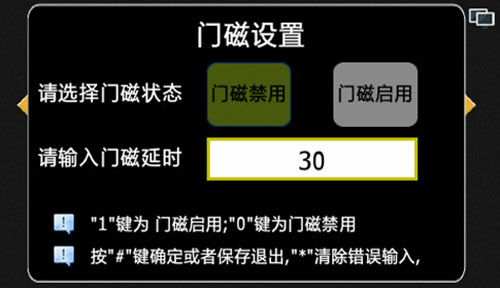 1) 設置門磁的啟用和禁用狀態,以及門磁的延時。默認門磁為禁用,延時為30秒,按“0”選擇門磁禁用,按“1”選擇門磁啟用,“*”鍵清除延時時間或退出門磁設置界面,“#”鍵保存設置并退出,如圖4.8.1: