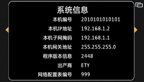 1) 可查看當前設置的系統信息,包括房號,IP地址,子網掩碼,網關地址,程序版本,出場商,網絡配置表型號,按“*”鍵退出查看界面,界面如圖4.11.1: