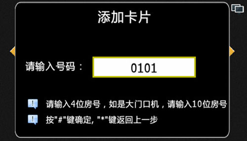 2) 添加IC卡操作:輸入需要添加IC卡的房號,如果是在單元機上,輸入4位例如0101,如果是在圍墻機上,輸入10位房號例如0102010101(1區2棟1單元101戶),按“#”鍵確認,如圖4.12.2: