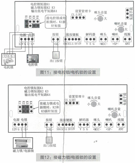 主機主板上的"K1-K4"插針(如圖10所示)是設置開鎖信號的,出廠時主機默認是接普通電鎖的(默認是短接K1,如圖11所示),如果使用磁力鎖或電插鎖,那么把插針帽換插到"K2"和"K3"插針的位置(即短接"K2"和"K3"插針,如圖12所示),如果需要輸出低電平信號,那么短接"K4"插針即可.